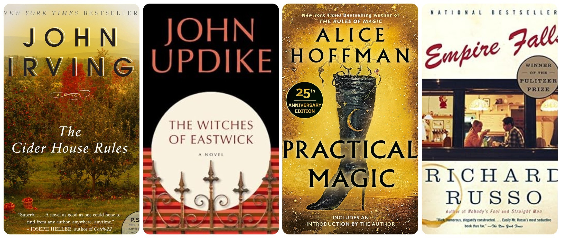 If there’s room in your suitcase, be sure to pack a couple of books that take place in New England during the fall. “Cider House Rules,” by John Irving, “The Witches of Eastwick,” by John Updike, “Practical Magic,” by Alice Hoffman, and “Empire Falls” by Richard Russo, will set the scene for your trip. “Little Women,” Louisa May Alcott's 1868 novel about sisters growing up in Concord, Mass., during the Civil War, would also be appropriate; Concord is less than 20 miles northwest of Boston.